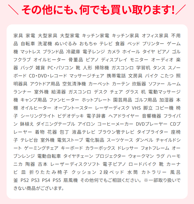 | 買取可能な品物 | 【ジャンル問わず何でも買取可能】 大型家具・家電/PC/自転車/楽器/ゴルフクラブ/タンス/テーブル・机/タイヤ・ホイール/ジュエリー・貴金属/プリンター/エアコン/スマホ・ガラケー/電子レンジ/ピアノ/ゲーム機器/ブランド品/布団・マットレス/オイルヒーター/モニター・ディスプレイ/スキー板・スノーボードなど |