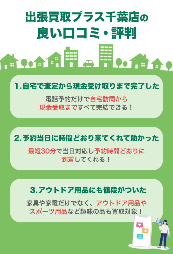 出張買取プラス千葉店には、サービスの便利さや対応の丁寧さを評価する口コミが寄せられています。