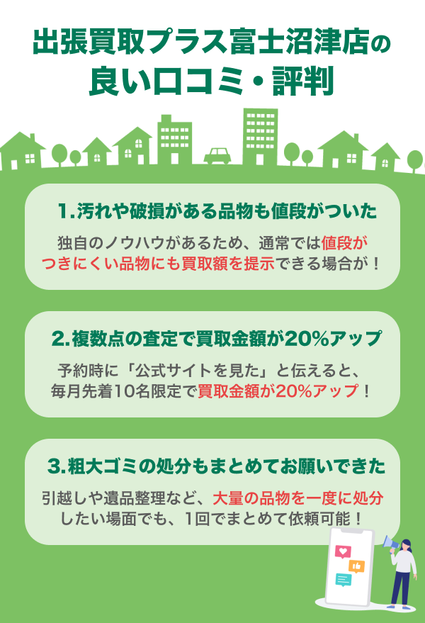 この記事では、出張買取プラス富士沼津店の口コミ・評判を良い面・悪い面の両方から紹介します。