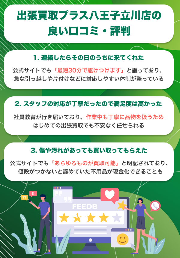 出張買取プラス八王子立川店について、実際の利用者の口コミ・評判を忖度なしでまとめます。