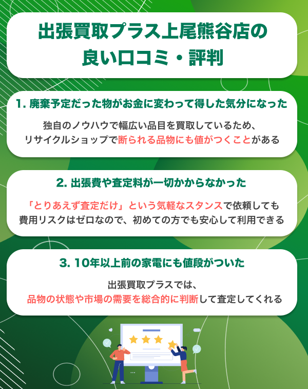 良い口コミとしては「捨てるつもりだった物がお金になった」「手数料が一切かからなかった」「古い家電にも値段がついた」といった声が見られます。