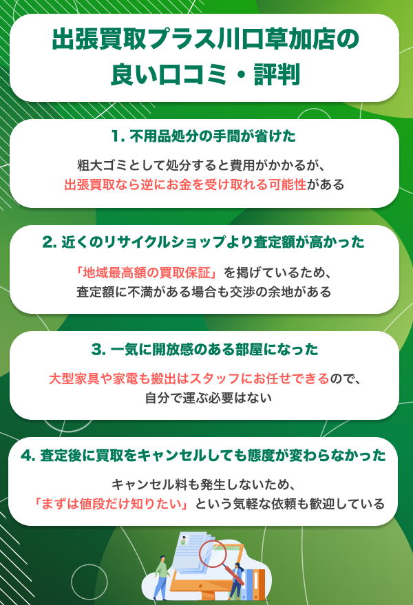 そこで本記事では、出張買取プラス川口草加店の良い・悪い口コミ・評判を紹介します。
