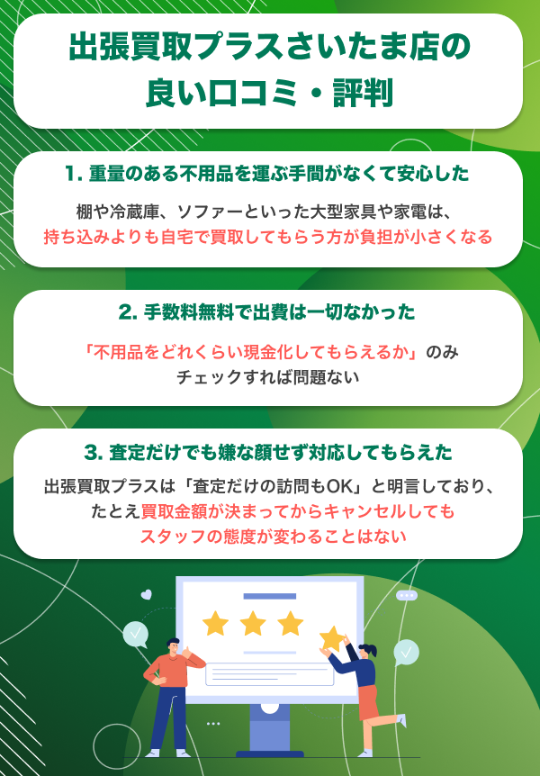 そこで本記事では、出張買取プラスさいたま店の良い・悪い口コミ・評判を紹介します。