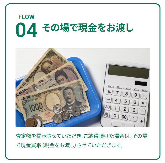 「本当に支払ってもらえるのか」という不安を感じることなく、査定から支払いまでを一度の訪問で完結できます。