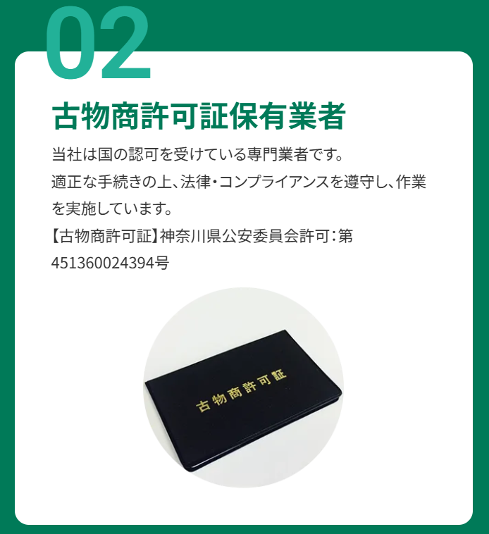 出張買取プラスは、神奈川県公安委員会から古物商許可(第451360024394号)を取得して運営しています。