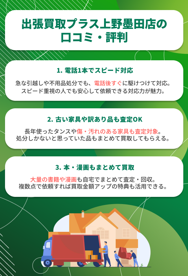 この記事では、出張買取プラス上野墨田店の口コミ・評判を良い面・悪い面の両方から紹介します。