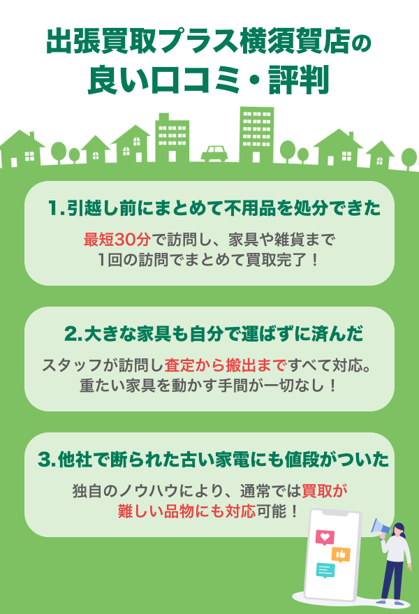 出張買取プラス横須賀店の口コミや基本情報をもとに、出張買取プラス横須賀店の利用が向いている人の特徴をまとめました。